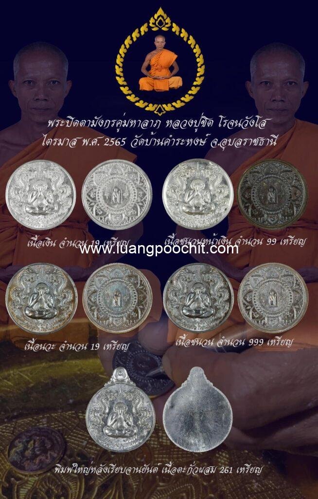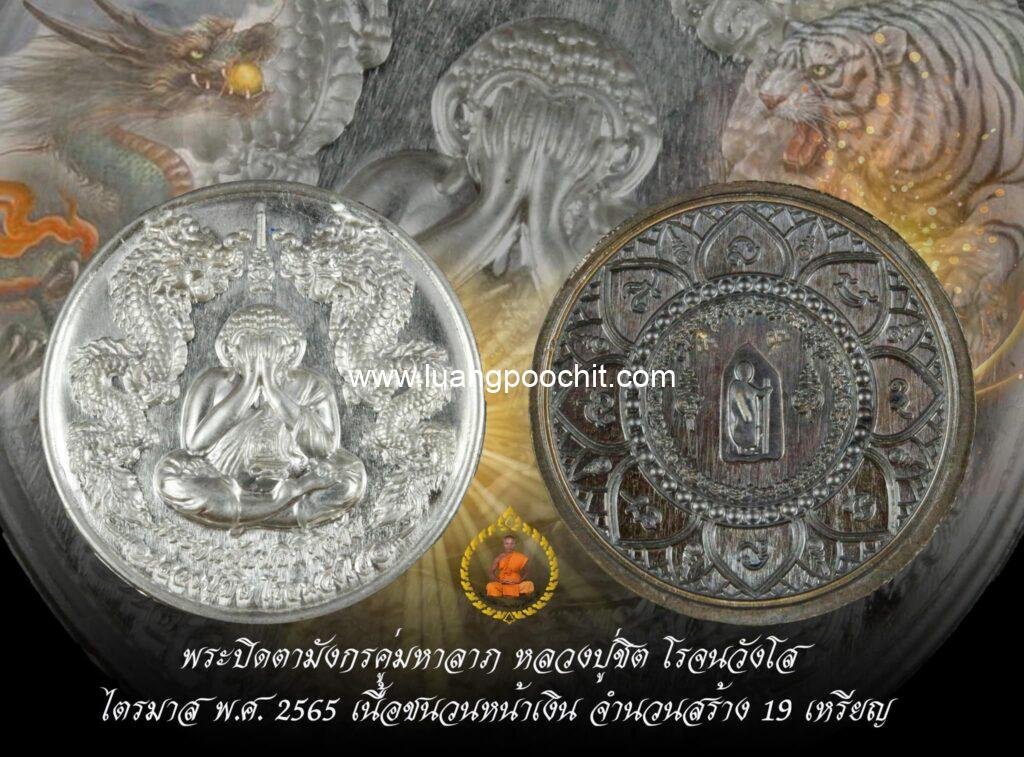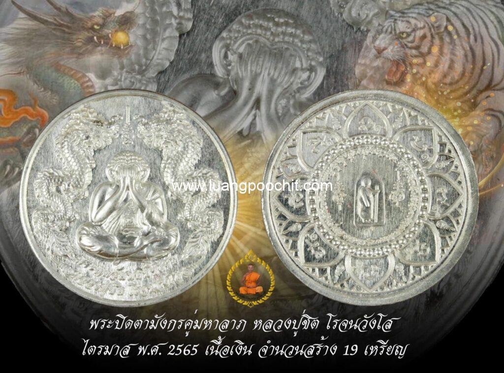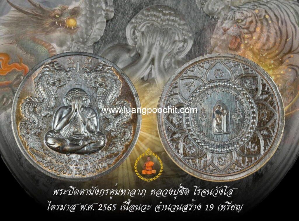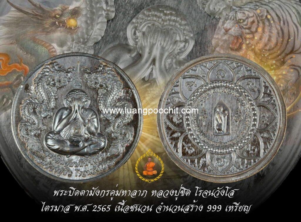 เหรียญพระภควัมบดีพิชิตชัย (พระปิดตามังกรคู่มหาลาภ) หลวงปู่ชิต โรจนวังโส ไตรมาส 2565 ที่มาของการจัดสร้างวัตถุมงรุ่นนี้ เนื่องจากว่าการจัดทำวัตถุมงคลของหลวงปู่ ซึ่งเริ่มขึ้นตั้งแต่ปี 2558 แต่ว่ายังไม่มีความชัดเจนนัก โดยหลวงปู่ทำเอง เป็นว่านบ้าง เป็นตะกรุดบ้าง ซึ่งหลวงปู่จะเน้นมวลสารที่ให้ทางโชคลาภ เมตตา ค้าขาย เป็นหลัก จวบจนถึงปีนี้ มีลูกศิษย์ลูกหาจำนวนมากขึ้น หลวงปู่จัดทำเอง ปั้นมือหามวลสาร ก็ค่อยข้างจะยาก หลวงปู่จึงมีดำริ ให้จัดสร้างเหรียญขึ้นมา เพื่อให้ไว้แก่ลูกศิษย์ผู่ที่เคารพศรัทธาในองค์หลวงปู่ เพื่อเป็นเครื่องเตือนสติให้ตั้งอยู่ในความดีละเว้นความชั่ว เพื่อเป็นขวัญกำลังใจในหน้าที่การงาน ไปไหนมาไหนให้เดินทางอย่างมีสติ ให้เดินทางปลอดภัยดี จึงเป็นการก่อกำเนิดเหรียญรุ่นแรกนี้ขึ้น ทั้งนี้หลวงปู่ได้มอบชนวนมวลสารในการสร้างเหรียญ มีก้อนเงิน ก้อนทองคำ แท่งชนวนมวลสาร และเหรียญพระเกจิเก่าที่หลวงปู่เก็บไว้ ซึ่งมีสภาพสึกหรอมาก ให้มาหลอมเป็นมวลสารสำคัญที่จะสร้างเหรียญรุ่นแรกนี้ **เหรียญรุ่นแรก การออกแบบด้านหน้าเหรียญนั้นได้เอาแบบเหรียญพระเกจิเก่า ที่หลวงปู่มอบมา ให้เป็นชนวนมวลสารมาเป็นต้นแบบของเหรียญ ซึ่งรูปแบบเป็นรูปนั่งเต็มองค์ มีอักขระพระคาถายันต์ มะ โม พุท ธา ยะ และ พระคาถายันต์ นะมะนะอะ นอกอนะกะ กอออนออะ นะอะกะอัง ตามแบบเค้าโครงเหรียญพระเกจิเก่า ส่วนด้านหลังเป็นรูปพระงานเข้า ล้อมรอบด้วยพระคาถายันต์พญาไก่เถื่อนของสมเด็จพระสังฆราชสุก ไก่เถื่อน พระคาถายันต์ นะ มะ พะ ทะ และ นะ ชา ลี ติ แล้วมีดอกบัวบานอยู่ด้วย เหรียญพระเกจิเก่าที่หลวงปู่มอบมาให้เป็นชนวนมวลสาร หลวงปู่บอกว่าเหรียญนี้มีพลังมาก เด่นทางเมตตาค้าขาย แคล้วคลาดปลอดภัย ซึ่งสภาพเหรียญนั้นสึกหรอมากภาพเลือนลาง ถ้าเก็บเอาไว้บูชาบารมีของท่านก็จะอยู่เพียงเท่านี้ เพื่อเผยแผ่บารมีให้แผ่ไพศาล ให้ลูกศิษย์ลูกหาได้อาศัยบารมี หลวงปู่จึงได้ขอบารมีทำพิธีพลีมวลสาร นำมาหล่อเป็นชนวนมวลสารให้กับเหรียญรุ่นแรกของหลวงปู่ ซึ่งวัตถุมงคลชุดนี้ จึงจัดได้ว่าเป็นที่สุดยอดของมวลสาร ทั้งก้อนเงิน ก้อนทอง และเหรียญเกจิเก่า จึงถือว่าเป็นเหรียญสองบารมี ทั้งพระเกจิสมัยก่อน และหลวงปู่ชิต **เหรียญพระปิดตามังกรคู่มหาลาภ โดยหลวงปู่ถือเคล็ดว่า ปีนี้ปีเสือ เสือคู่มังกร เสือเป็นเจ้าพยัคฆ์อยู่พากพื้นดิน ส่วนมังกรเป็นเจ้าแห่งท้องฟ้า เจ้าแห่งท้องทะเล ทั้งสองอย่างจะมาเกื้อหนุนกัน ซึ่งเราจะเห็นได้ว่า ในตำราหลักฮวงจุ้ยจีน ก็จะมีเสือขาว มังก